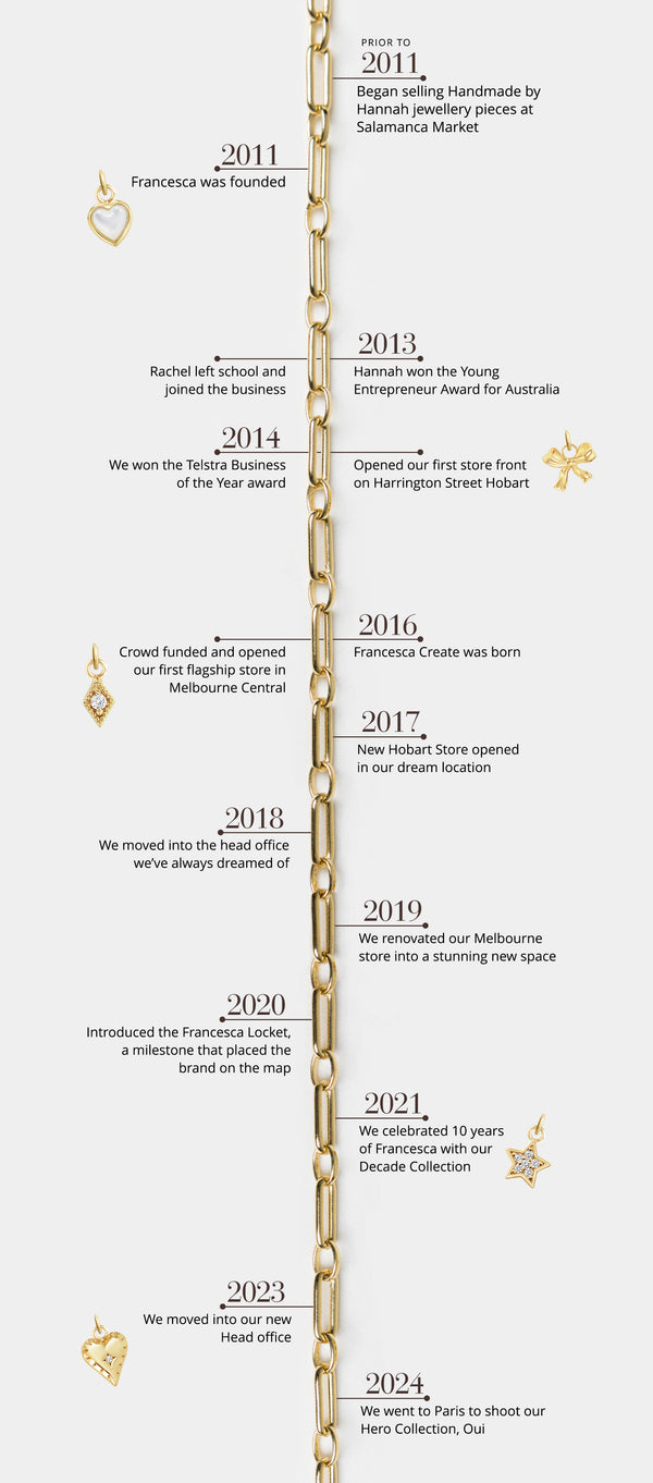 Hannah began making jewellery at the age of 12 and started selling her jewellery at Salamanca Market at the age of 16. Her collection gained popularity at the market and the business was rebranded to Francesca (the name her mother wanted to give her!) whilst she was studying Science & Law at University. During her studies the business grew, and in 2013 after winning the young entrepreneur award for Australia she decided to take the leap and pursue her passion, Francesca, leaving the possibility of a career as a lawyer. It was the same year that Rachel finished school, so the two grabbed this amazing opportunity to turn their dreams into reality and ran with it, having never looked back!